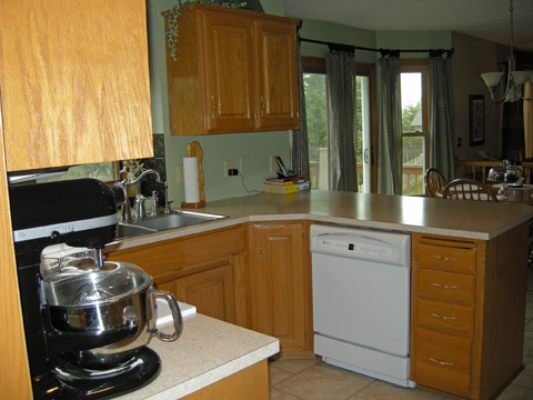 I must say, as much as I love my job, I am happy that I have the next 2 days off. Between a lack of sleep due to thunderstorms and a doggy that is terrified of them, and all the things that need doing around the house I could use a big kick of ambition and a couple days of sleep. One of which is not going to happen. It's hard to get anything done if you are sleeping and the project Dan and I started last weekend really needs to get finished before Abby graduates in July and we have a house full of people! What project is that you ask? Or maybe you don't ask but I'm going to tell you anyway...we are doing a partial renovation of the kitchen. With the appliances starting to go bad or parts on them breaking, it is time to start replacing them. Since the flooring runs under the dishwasher, I saw no sense in replacing the dishwasher without replacing the floor which was damaged. Did you know that laminate flooring and water do not mix? A concept that some do not entirely grasp in this house. I saw no sense in replacing the floor when I wanted to remove part of the cabinets and counter and move the location of the dishwasher. I have a one butt kitchen. By removing the "L" part of my counters, my kitchen becomes at least a 2 butt kitchen. But this would leave a hole in the flooring as they do not lay flooring under the cabinets. So it only makes sense to remove the "L", change the floor, replace and move the dishwasher which is unfortunately going to involve new counter tops at some point. Since I am replacing the dishwasher with black instead of white, the other appliances will also need to be changed sooner rather than later. Since I am loosing 4 of the 7 drawers I have in my kitchen by chopping off the "L" I need to buy a new cabinet to replace them and so forth and so on...this is commonly referred to in these parts as The Snowball Effect. I would love to replace all the cupboards. I am so over orangey oak...you have no idea. But, I cannot afford to do that. So for right now, it will be a partial renovation and who knows, I may end up loving my orange cabinets! NOT!
